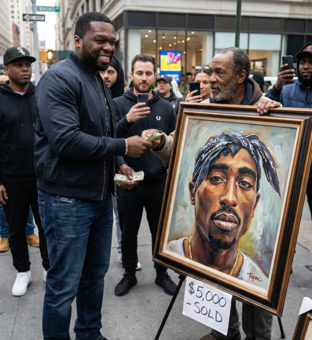 A powerful moment involving 50 Cent and the legacy of Tupac Shakur recently captured attention, not because of spectacle, but because of respect and intention. On an ordinary day at a busy street corner, 50 Cent noticed something that many others passed without a second glance—a hand-painted portrait of Tupac created by a street artist. The artwork was detailed, emotional, and striking, reflecting not just Tupac’s image, but his enduring spirit.